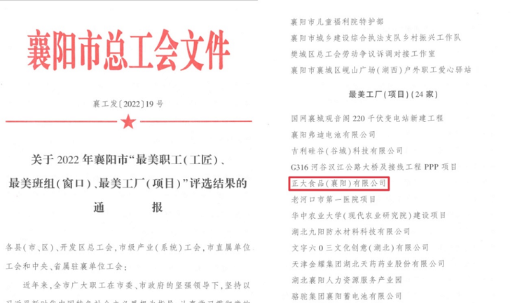 為廣泛開展美好環(huán)境與幸福生活共同締造活動(dòng),評(píng)選為襄陽(yáng)市經(jīng)濟(jì)社會(huì)高質(zhì)量發(fā)展做出積極貢獻(xiàn)的單位和群體及個(gè)人,襄陽(yáng)市總工會(huì)開展了尋找襄陽(yáng)市“最美職工(工匠)、最美工廠(項(xiàng)目)、最美班組(窗口)”的活動(dòng)。歷時(shí)2個(gè)月的多輪評(píng)定,襄陽(yáng)市總工會(huì)決定授予正大食品(襄陽(yáng))有限公司——襄陽(yáng)市“最美工廠(項(xiàng)目)”獎(jiǎng)項(xiàng)。